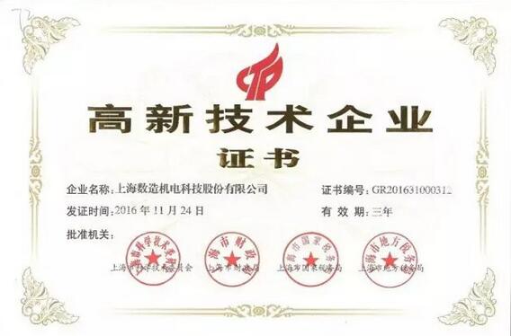 2017年2月7日,上海數(shù)造機(jī)電科技股份有限公司收到了由上海市科學(xué)技術(shù)委員會、上海市財(cái)政局、上海市國家稅務(wù)局、上海市地方稅務(wù)局聯(lián)合頒發(fā)的“高新技術(shù)企業(yè)”認(rèn)定證書,正式邁入國家高新技術(shù)企業(yè)行業(yè)。